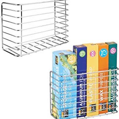 This 2 set rack is the perfect way to store aluminum foil, clear plastic wrap, saran wrap, parchment paper, waxed paper, sandwich bags, freezer bags, kitchen garbage bags and more without sacrificing your storage space.