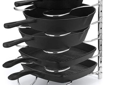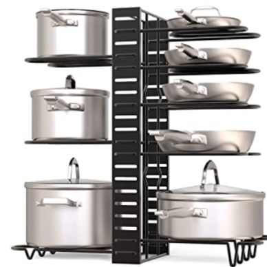 This height and position adjustable pot holders store up to 9 frying pans, sauce pans, griddles or pots of various sizes. It is a perfect solution for storing all the pot and pan, saving you lots of space in the kitchen or in cabinet and countertop.